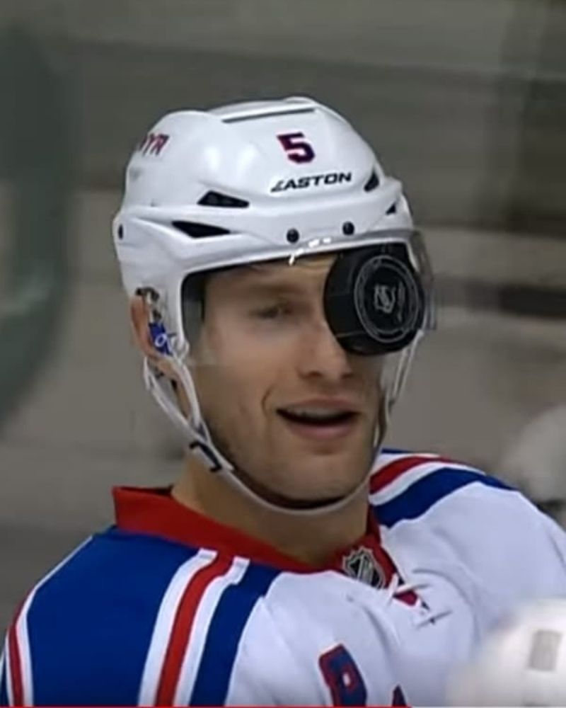 The coach must have emphasized the importance of concentrating on the puck before the game began – a point Dan Girardi appeared to have taken to heart, as evidenced in the photo. The baffling part, however, is figuring out how the puck ended up under his visor – a puzzle that might stay forever unsolved. His bemusement at the situation mirrors ours. Fortunately, Dan emerged unscathed. By swiftly removing the puck and carrying on with the game, he displayed excellent sportsmanship.