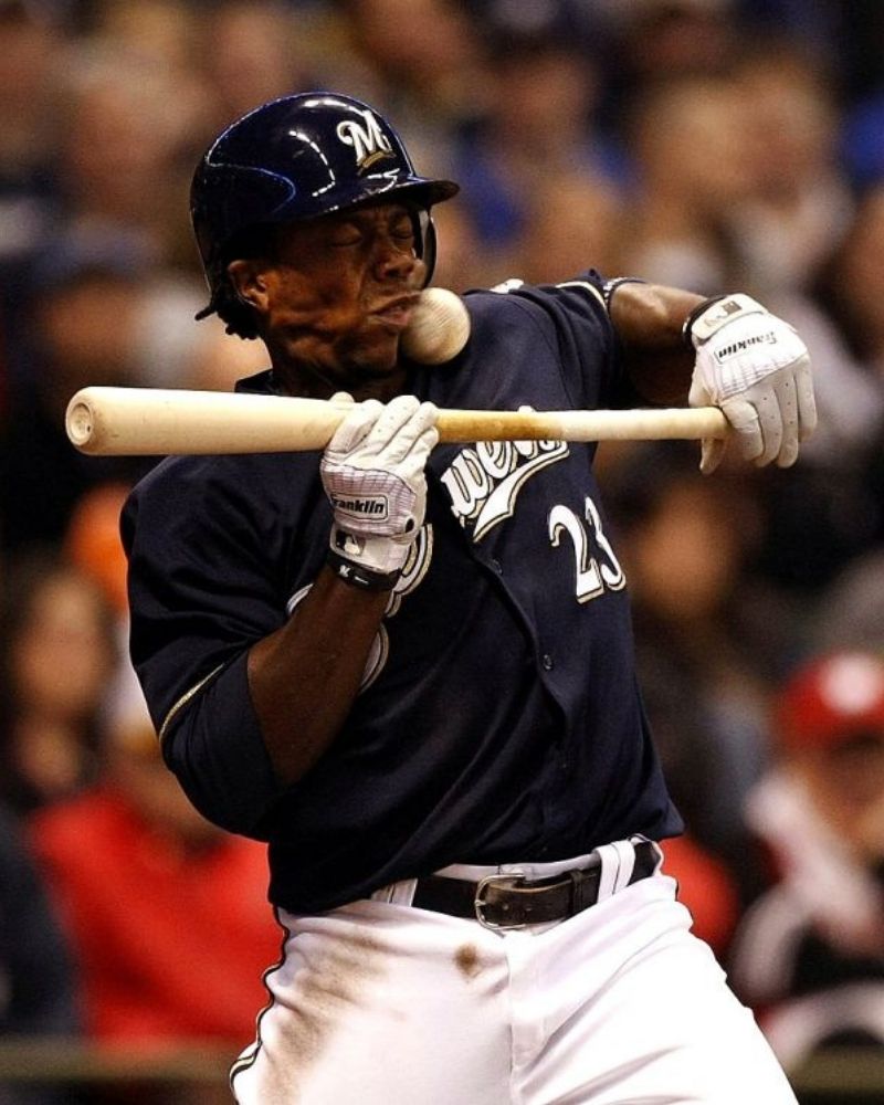 Envision being struck by a ball hurled at maximum velocity by a proficient baseball thrower. Unquestionably, no one would like to be in that situation. Regretfully for Rickie Weeks, his bat was slightly lower than it should have been, resulting in the ball fiercely colliding with his face. Just by looking at his photo, one could perceive the discomfort he experienced, and it’s easy for us to sympathize with his plight. We trust that medical team were present at the ground to attend to him after this distressing mishap, and fervently hope that he didn’t suffer any grievous injuries.