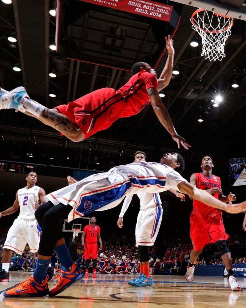 It’s common knowledge that a decent height is a prerequisite for those wanting to pursue a career in basketball. We often joke that these sportspeople must harbor some special abilities within them, a concept that this photograph seems to reinforce. The leap required to dunk the ball is clear, but it can appear as though this individual has invoked the powers of Superman and opted for flight instead. It stands to reason that such a fall would result in some discomfort or potential injury, assuming he isn’t as indestructible as the Man of Steel.