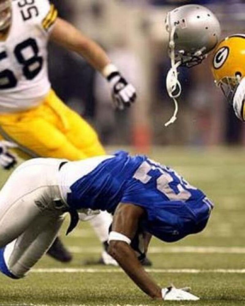 We discovered that the most entertaining pictures of individuals are often taken while they’re engaged in sports. Truth be told, many of us have dipped our feet into performing magic tricks at certain periods in our lives – and it was no different for this football player, who chose to display his prowess on the pitch. As evidenced in the photo, he thought it wise to obscure his face with his shirt while his helmet was sent hurtling towards his adversary. Perhaps it was an innovative ruse he was experimenting with, a diversion to confuse the opposing team as he sprinted for a scoring attempt.