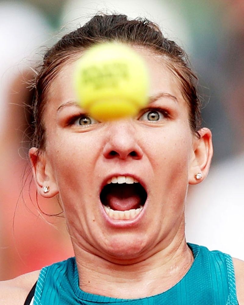 It’s undeniable that this is one of the most extraordinary candid photos captured during a tennis game. The image gives an illusion that Simona Halep’s face is about to collide with the airborne tennis ball; if it were one of us in her place, that likely would have been the result. But, Simona is far from a novice like us; her facial expression seems like she is about to let out a scream as she gathers strength to powerfully hit the ball back to her adversary. We’ve come to understand that silence isn’t an option in tennis, but that’s what makes these humorous facial expressions all the more entertaining to witness.