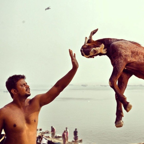 It appears from the photo that the man possesses some enchanting abilities to halt the goat right in its tracks just before it lunged at him. But that’s just an impression from the snapshot. Perhaps, moments after the picture was shot, the goat pounced on him? It’s impossible to be certain.